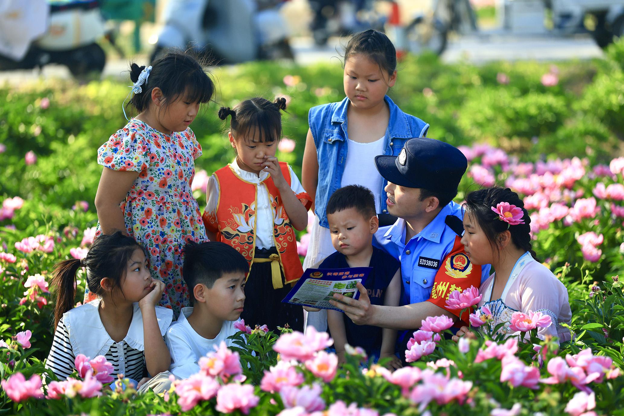 5月1日,安徽省亳州市公安局禁毒支隊民警走進(jìn)芍藥花海大世界,開展禁毒宣傳活動。