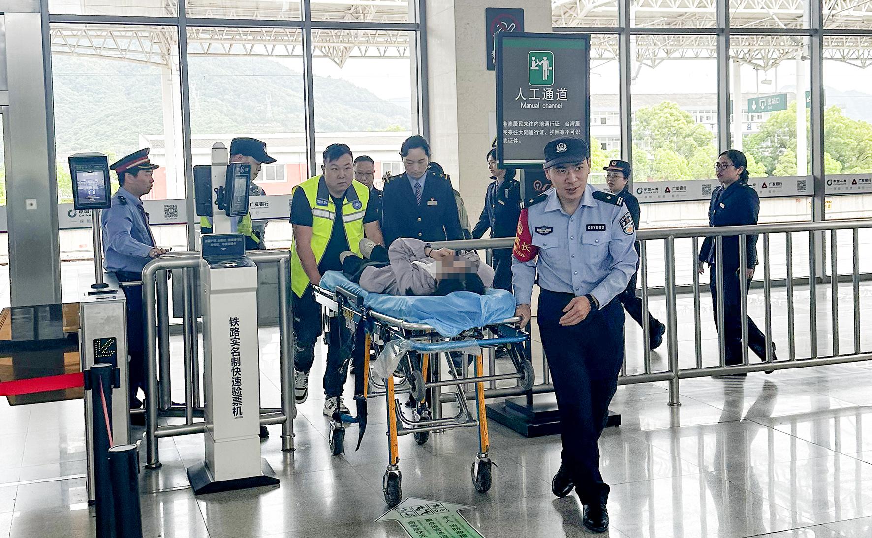 5月4日,D3301次列車一位女乘客突發(fā)疾病,杭州鐵路公安處臺州站派出所民警與醫(yī)護(hù)人員在三門站將旅客轉(zhuǎn)運至救護(hù)車。