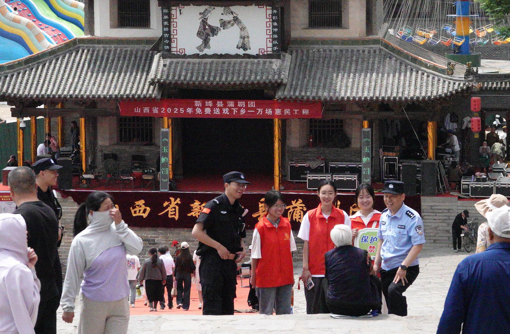 5月4日,山西省運城市新絳縣公安局民警與志愿者在絳州署景區(qū)服務(wù)游客。