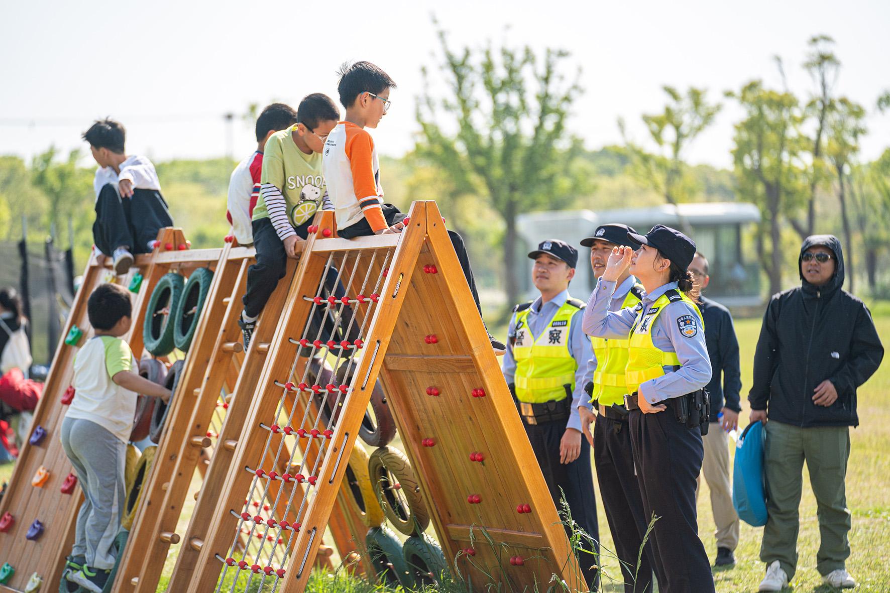 5月2日,上海市公安局崇明分局陳家鎮(zhèn)派出所民警在戶外音樂嘉年華兒童娛樂區(qū)域提醒小朋友們注意安全。
