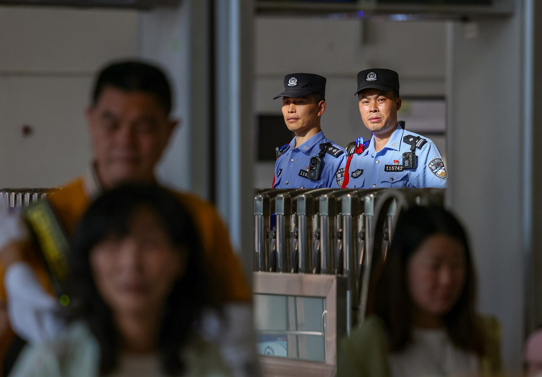 5月5日,安徽省舒城縣高鐵東站迎來“五一”假期返程高峰。舒城縣公安局千人橋派出所高鐵東站警務(wù)站民警輔警在入站口平臺疏導(dǎo)交通、服務(wù)群眾,確保返程旅客平安出行。