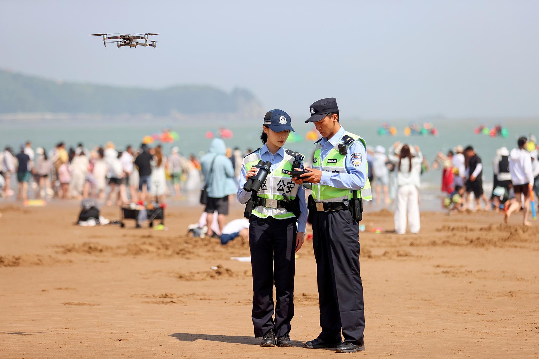 5月4日,浙江省舟山市公安局普陀山分局朱家尖派出所民警堅守在轄區(qū)景區(qū)一線,開展巡邏執(zhí)勤、無人機(jī)空中巡查等工作,守護(hù)游客平安。