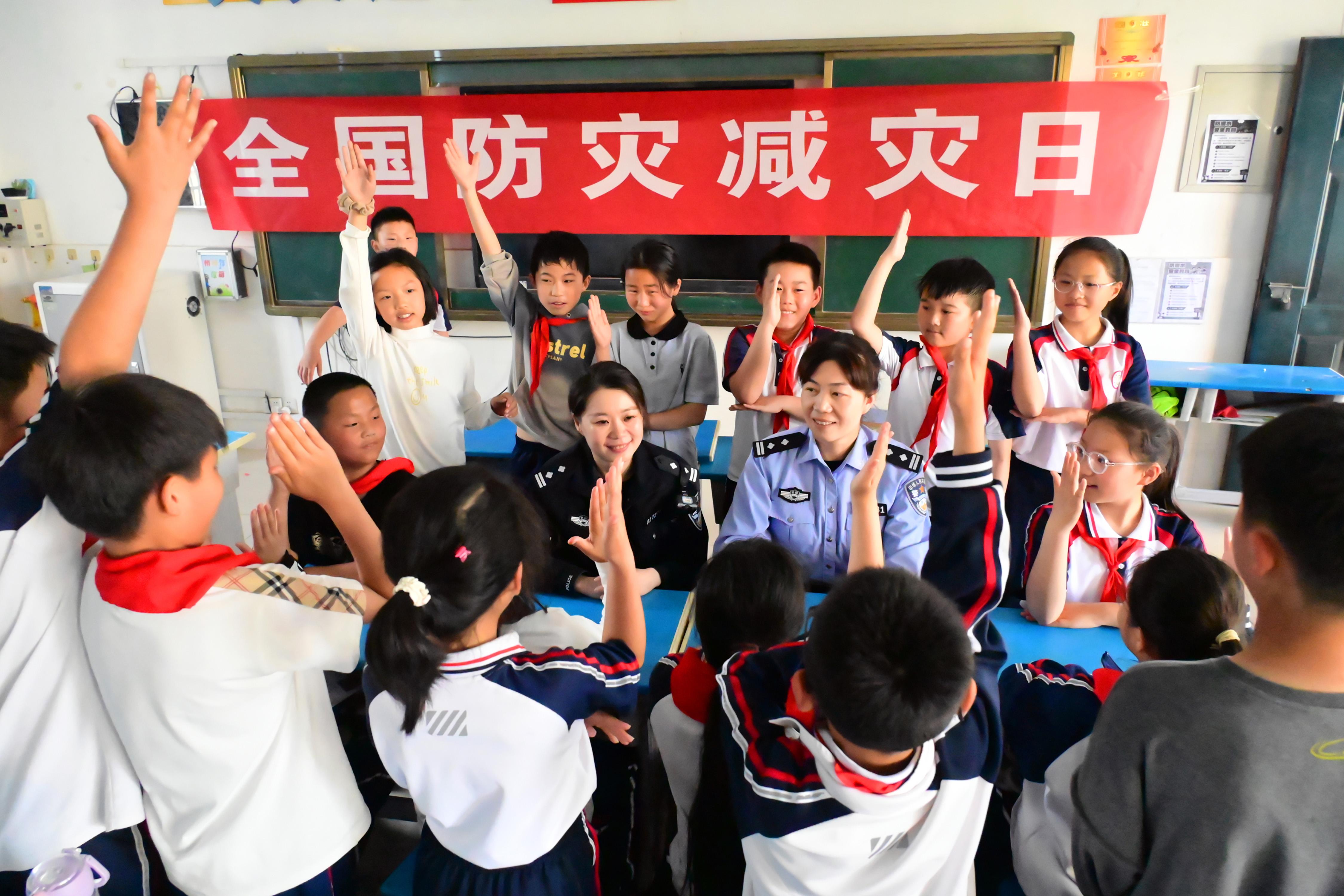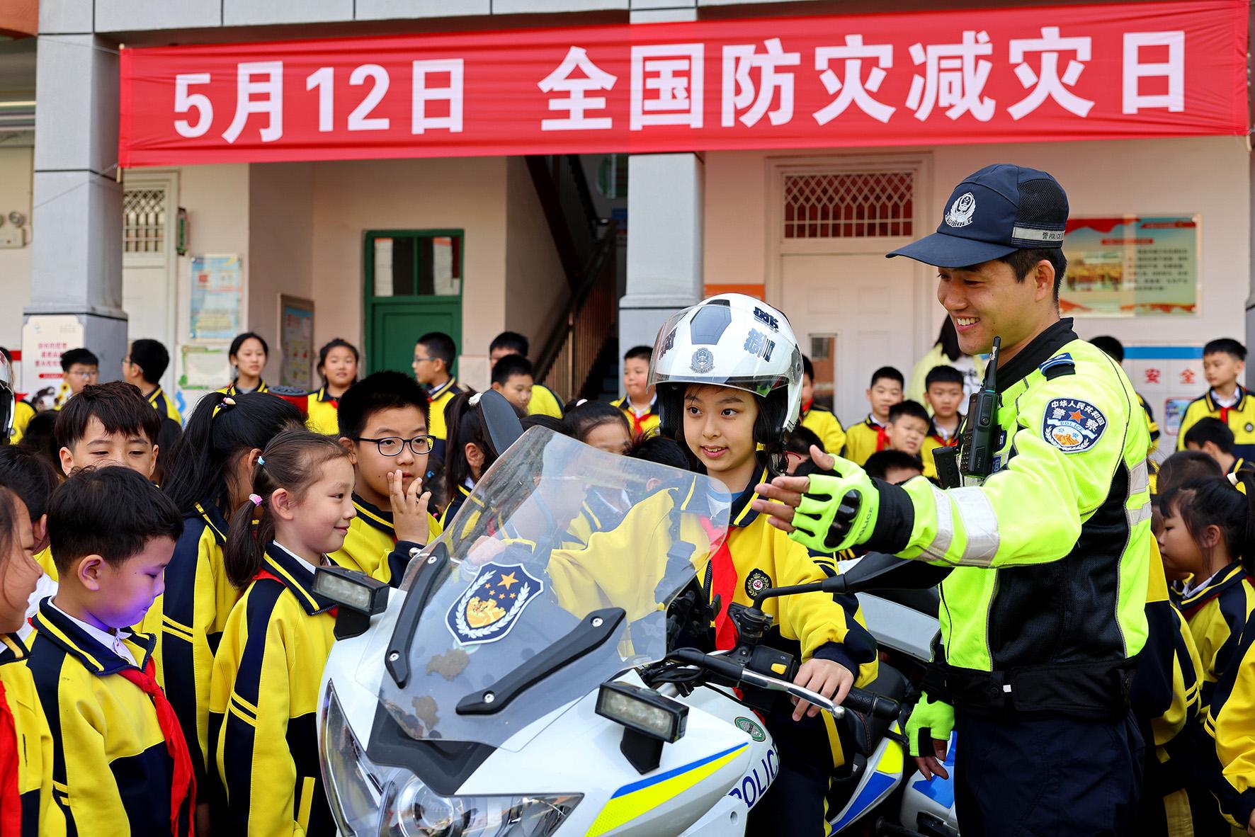 5月9日,安徽省蚌埠市固鎮(zhèn)縣公安局谷陽(yáng)派出所民警在第一小學(xué)向?qū)W生們講解地震、水災(zāi)、火災(zāi)等各類自然災(zāi)害的避險(xiǎn)方法。