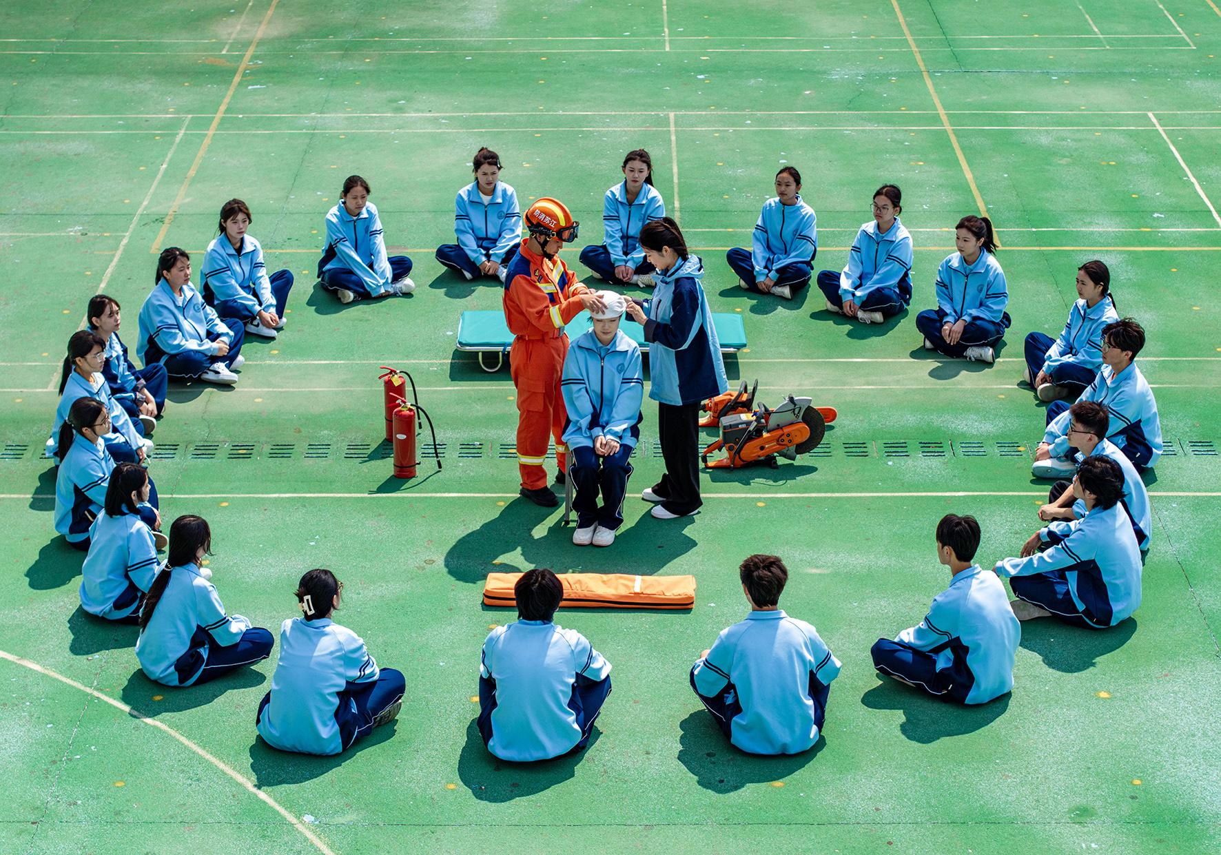 5月12日,江蘇省揚(yáng)州市邗江區(qū)消防救援大隊(duì)消防員在揚(yáng)州生活科技學(xué)校指導(dǎo)學(xué)生對(duì)傷員進(jìn)行快速包扎。