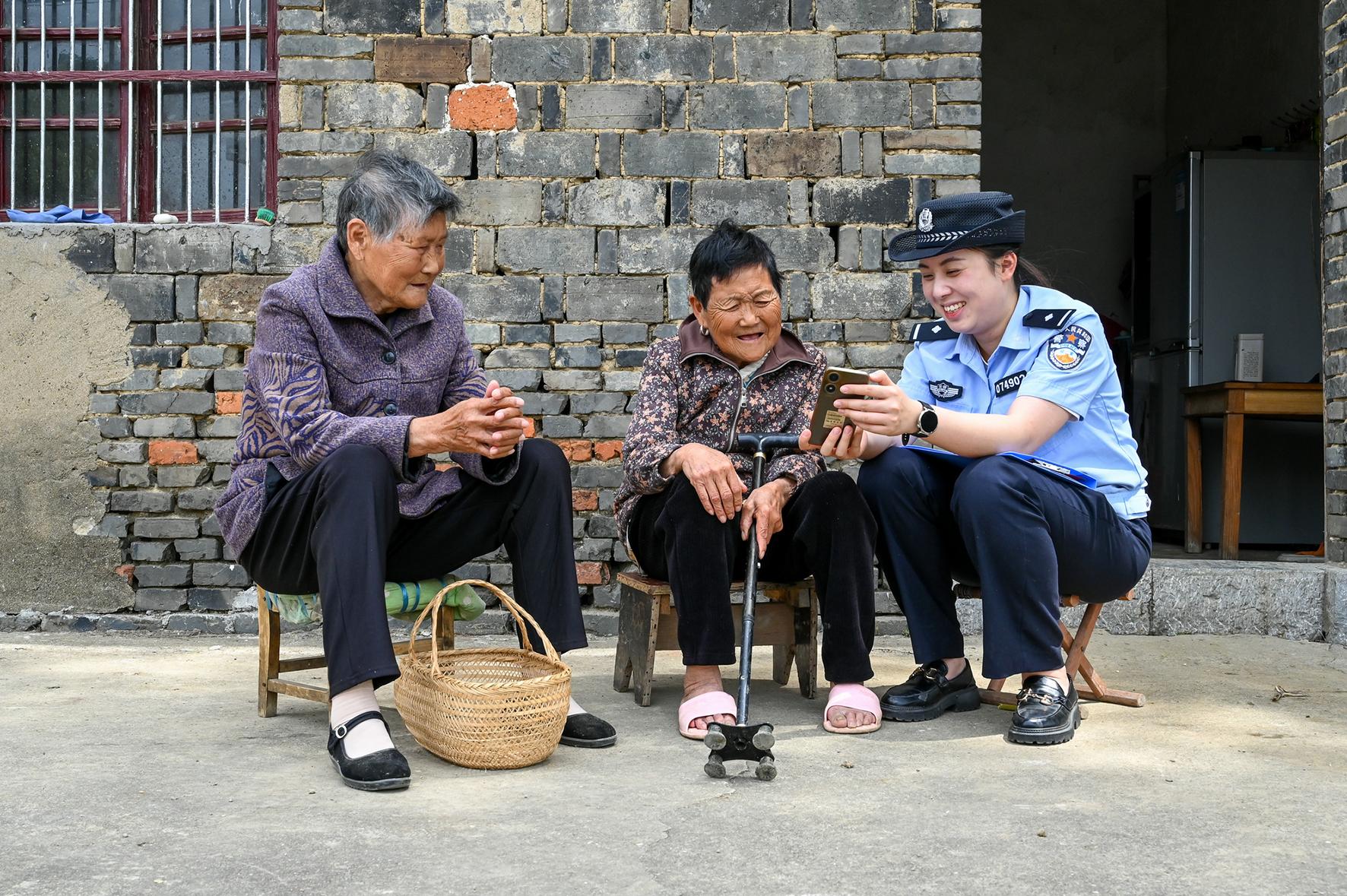 5月13日,在安徽省馬鞍山市和縣歷陽鎮(zhèn)興圩村,村警王雪純利用手機現(xiàn)場向老年人講解防范電信網(wǎng)絡(luò)詐騙知識。