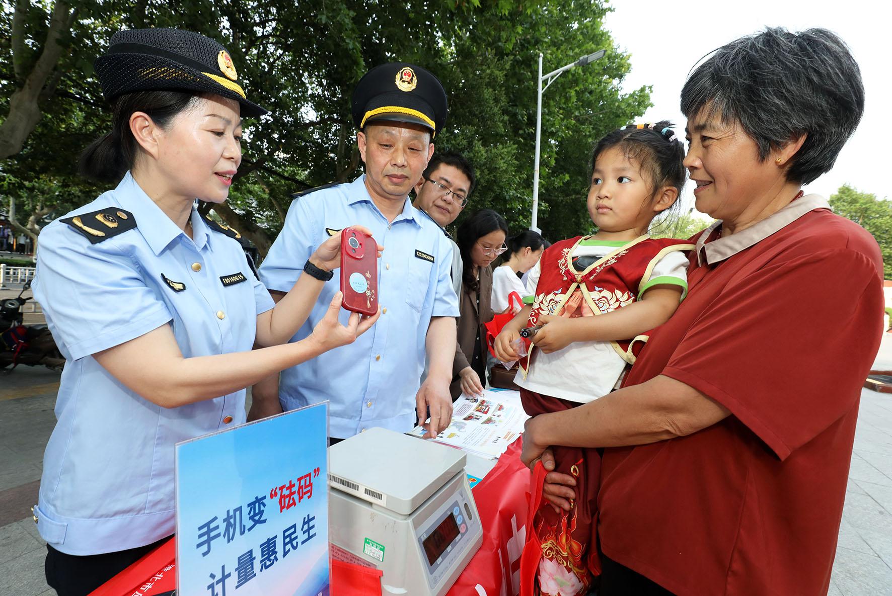 圖為工作人員為市民進(jìn)行手機(jī)稱(chēng)重,讓手機(jī)變身成隨身攜帶的標(biāo)準(zhǔn)“砝碼”。