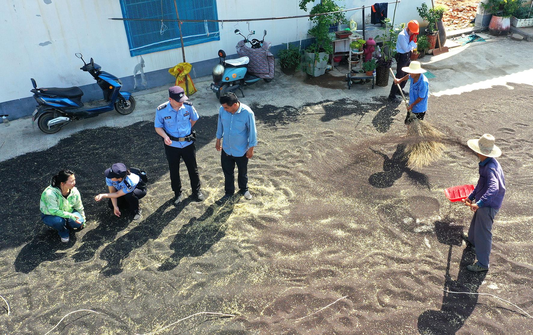 為扎實做好護航夏收夏種工作,5月19日,安徽省舒城縣公安局舒茶派出所民警輔警來到轄區(qū)沙墩村油菜籽晾曬場,走訪了解群眾所需,全力提供服務幫助。