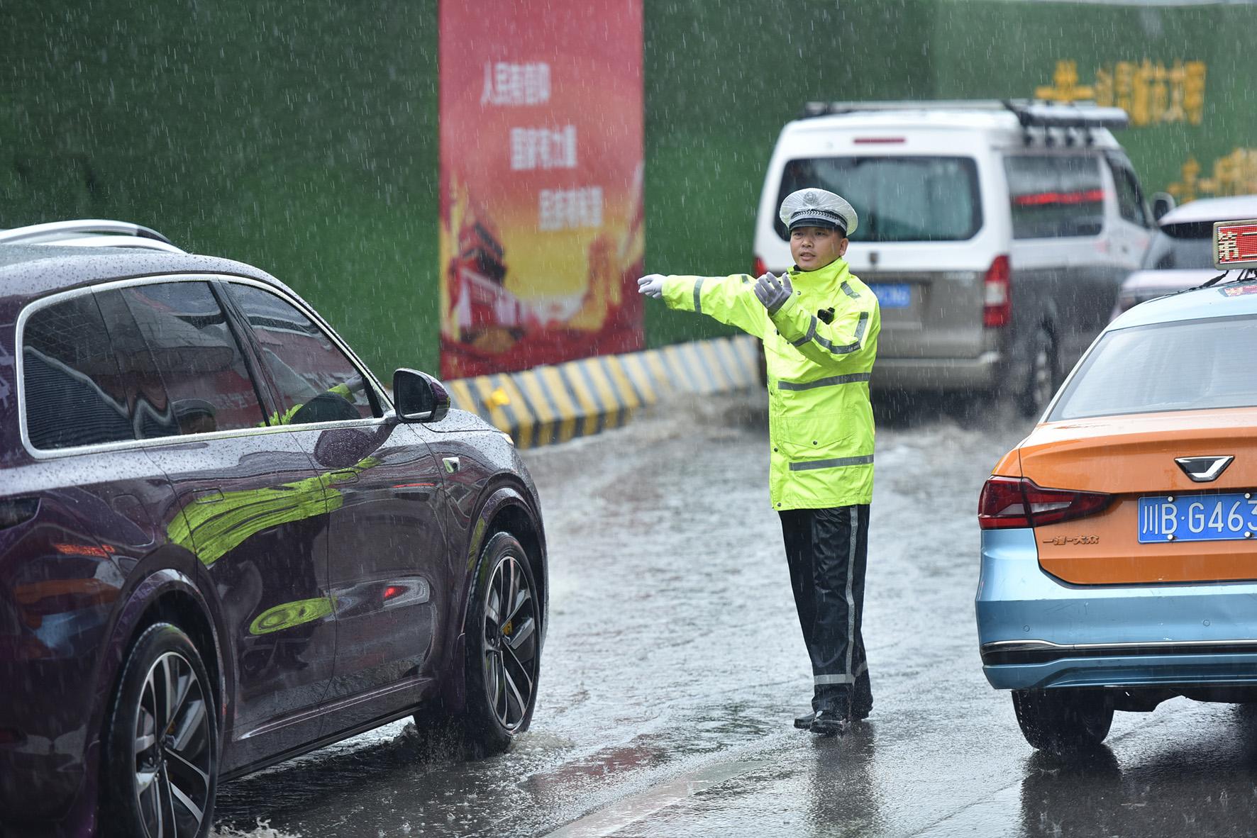 5月27日,四川綿陽遭遇強(qiáng)降雨天氣。綿陽市公安局交警支隊(duì)直屬一大隊(duì)民輔警提前上崗,在復(fù)雜路口、路段指揮疏導(dǎo)車輛,確保道路安全暢通。
