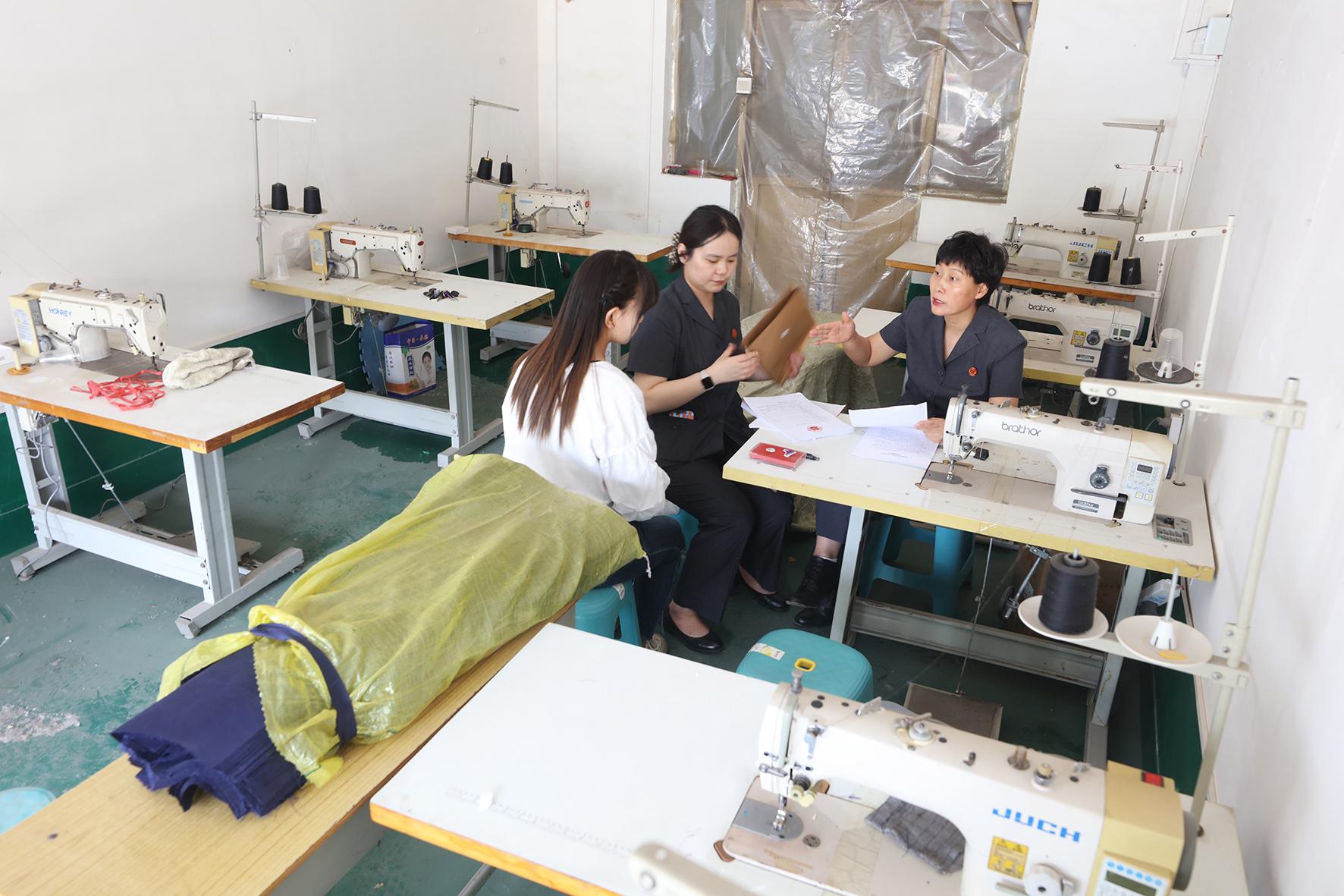 圖①:法官在現(xiàn)場與當(dāng)事人溝通涉案縫紉機(jī)交接事宜。