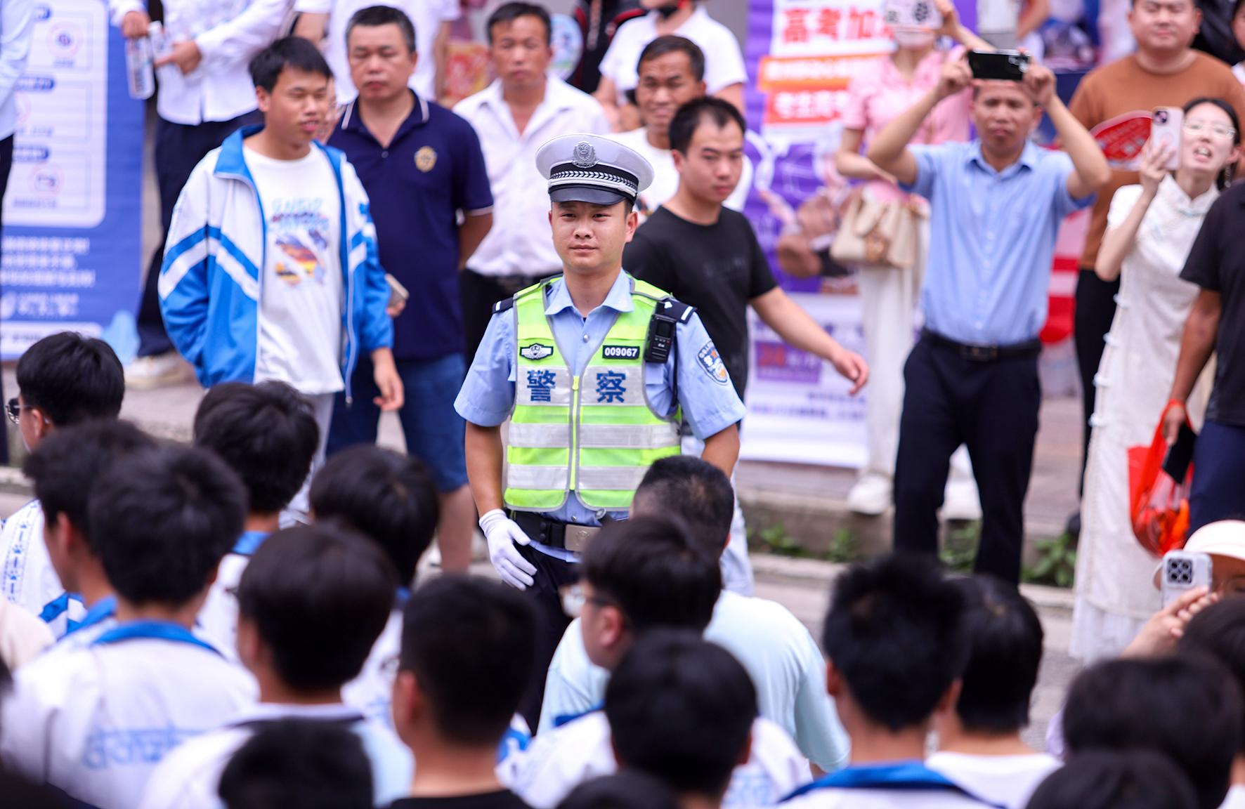 6月7日,在湖北省荊門市龍泉中學(xué)高考考點,荊門市公安局交警支隊民警在疏導(dǎo)送考車輛。