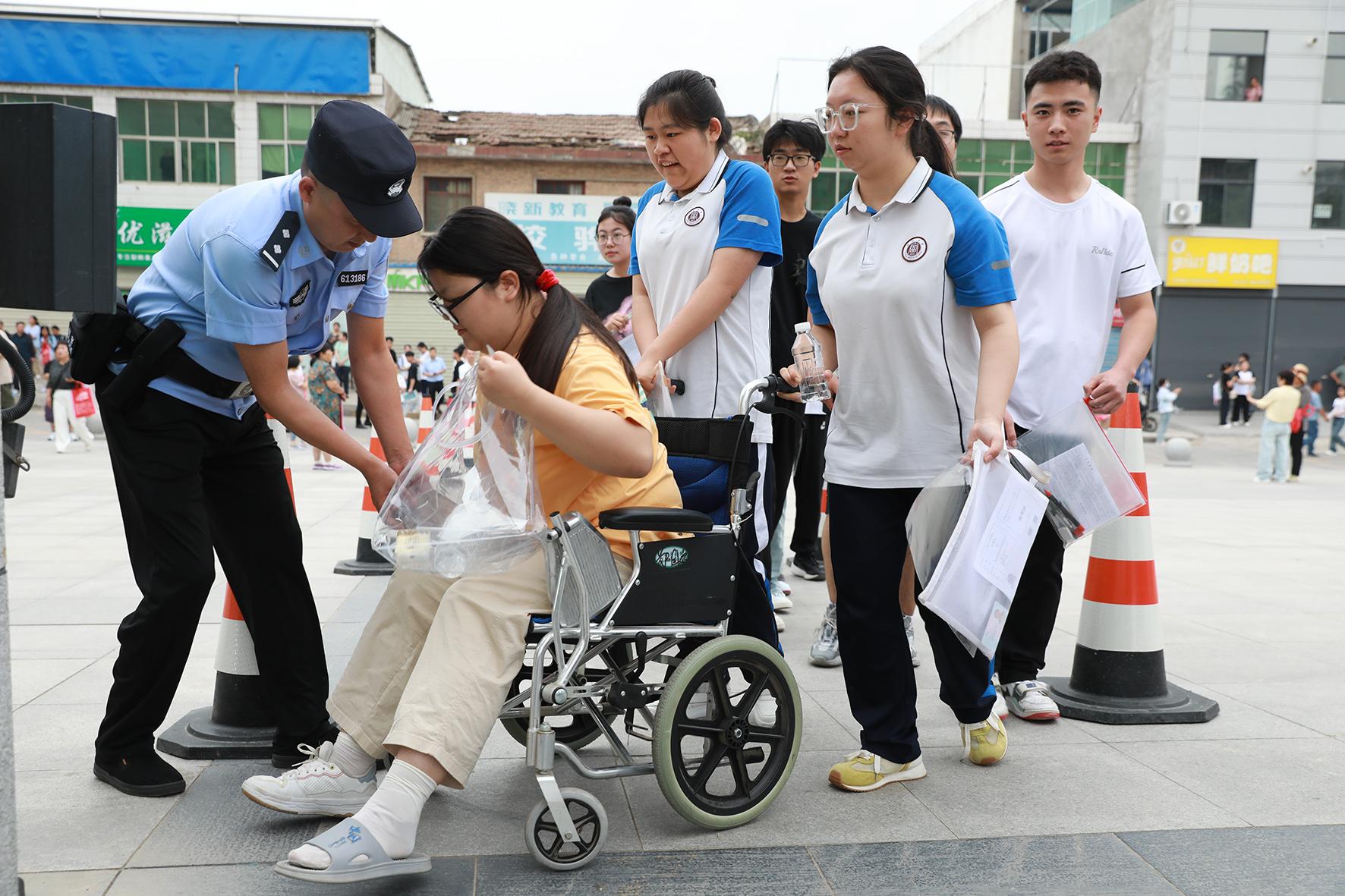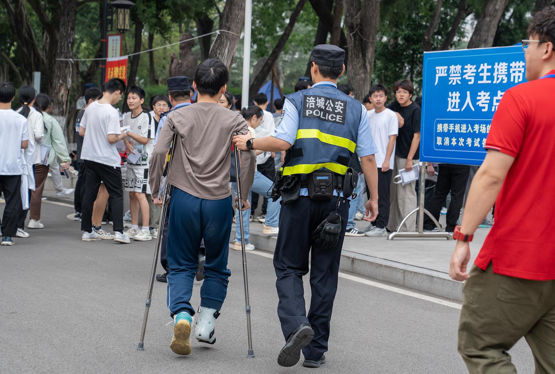 6月7日,陜西省富平縣公安局執(zhí)勤民輔警正在幫助受傷考生進(jìn)入考場。