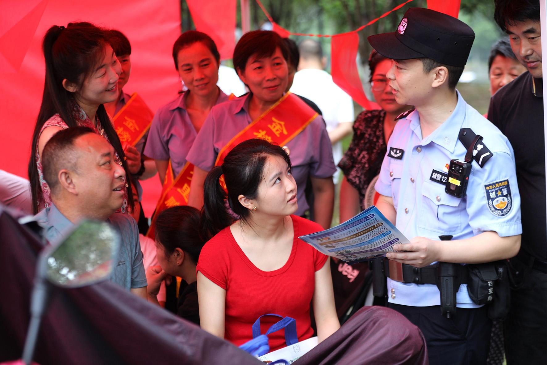 6月9日,安徽省宿松縣公安局交警大隊護(hù)考民輔警向家長宣傳防交通事故 、防溺水、防網(wǎng)絡(luò)詐騙知識。