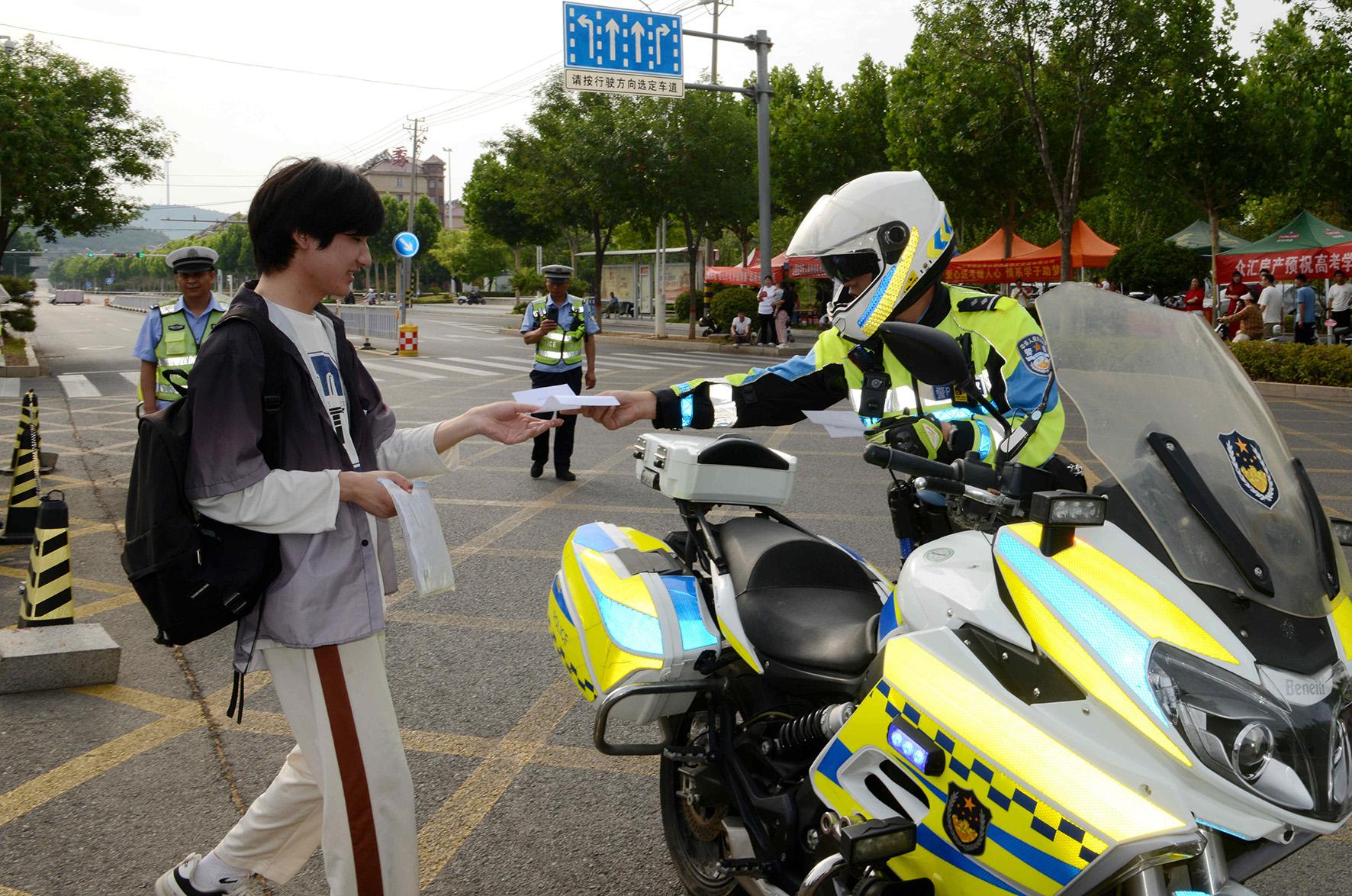 6月7日,安徽省馬鞍山市含山縣公安局民輔警在高考考點路段指揮疏導(dǎo)交通。