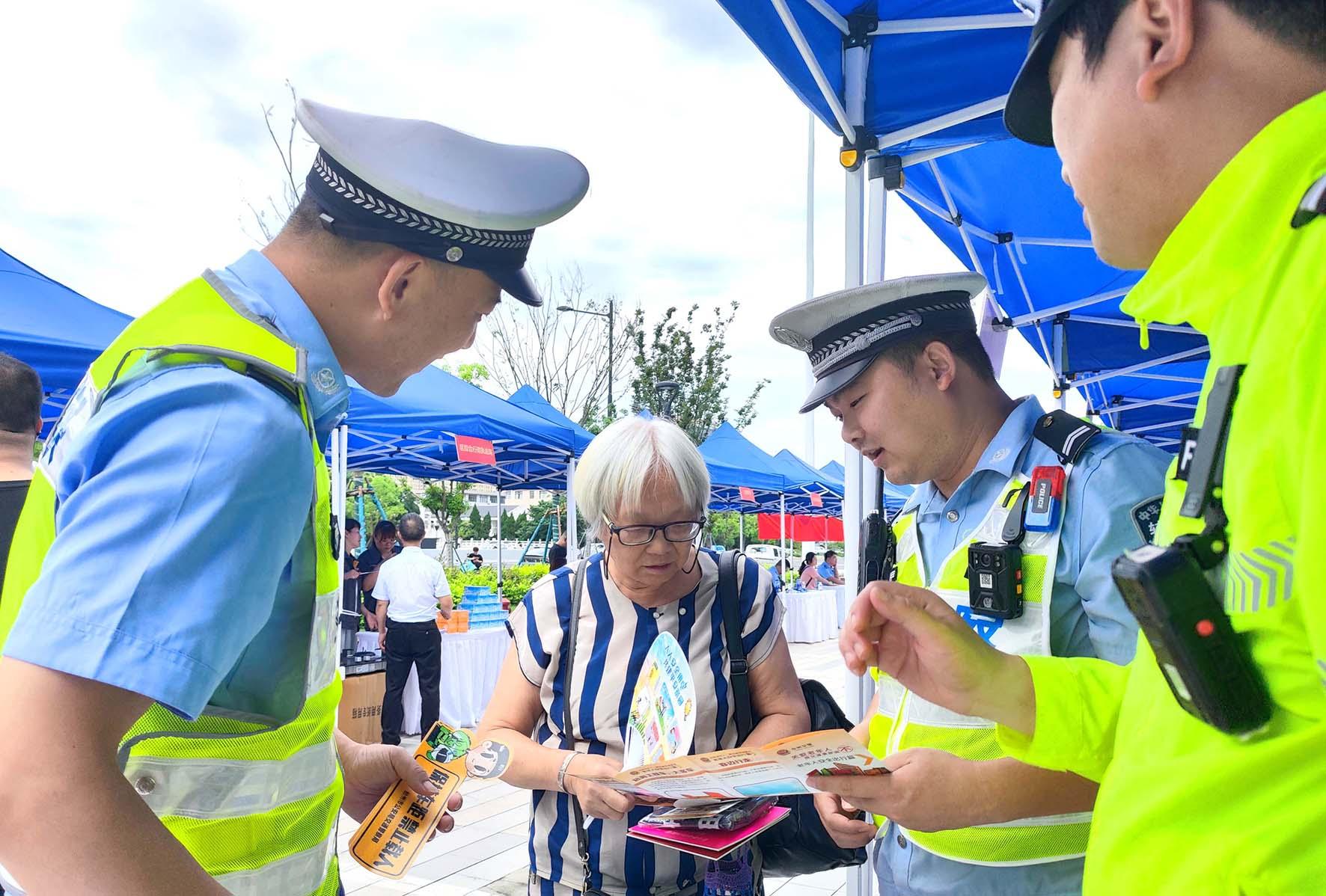 6月16日,浙江省臺州市公安局交通管理支隊直屬一大隊聯(lián)合臺州市公安局椒江分局在椒江寶龍城“擺攤”向群眾講解交通安全、反詐等安全防范知識。
