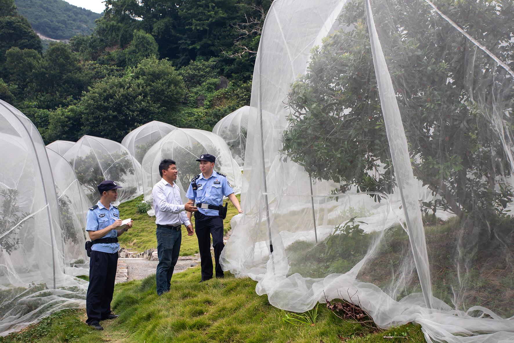 6月21日,浙江省臺(tái)州市公安局黃巖分局江口派出所民警輔警在東岙村楊梅采摘園巡邏走訪。