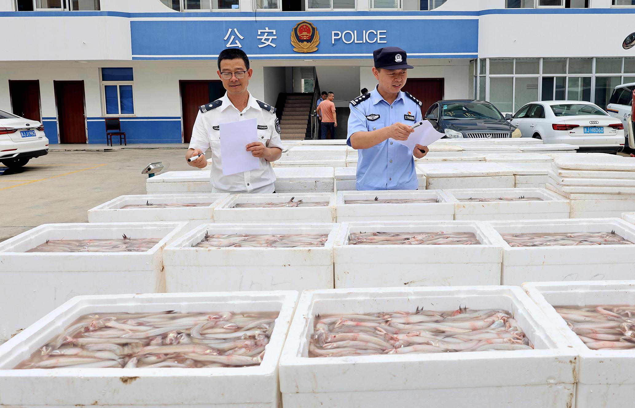 圖為海防大隊(duì)民警和漁業(yè)行政執(zhí)法人員在登記查扣的海產(chǎn)品。