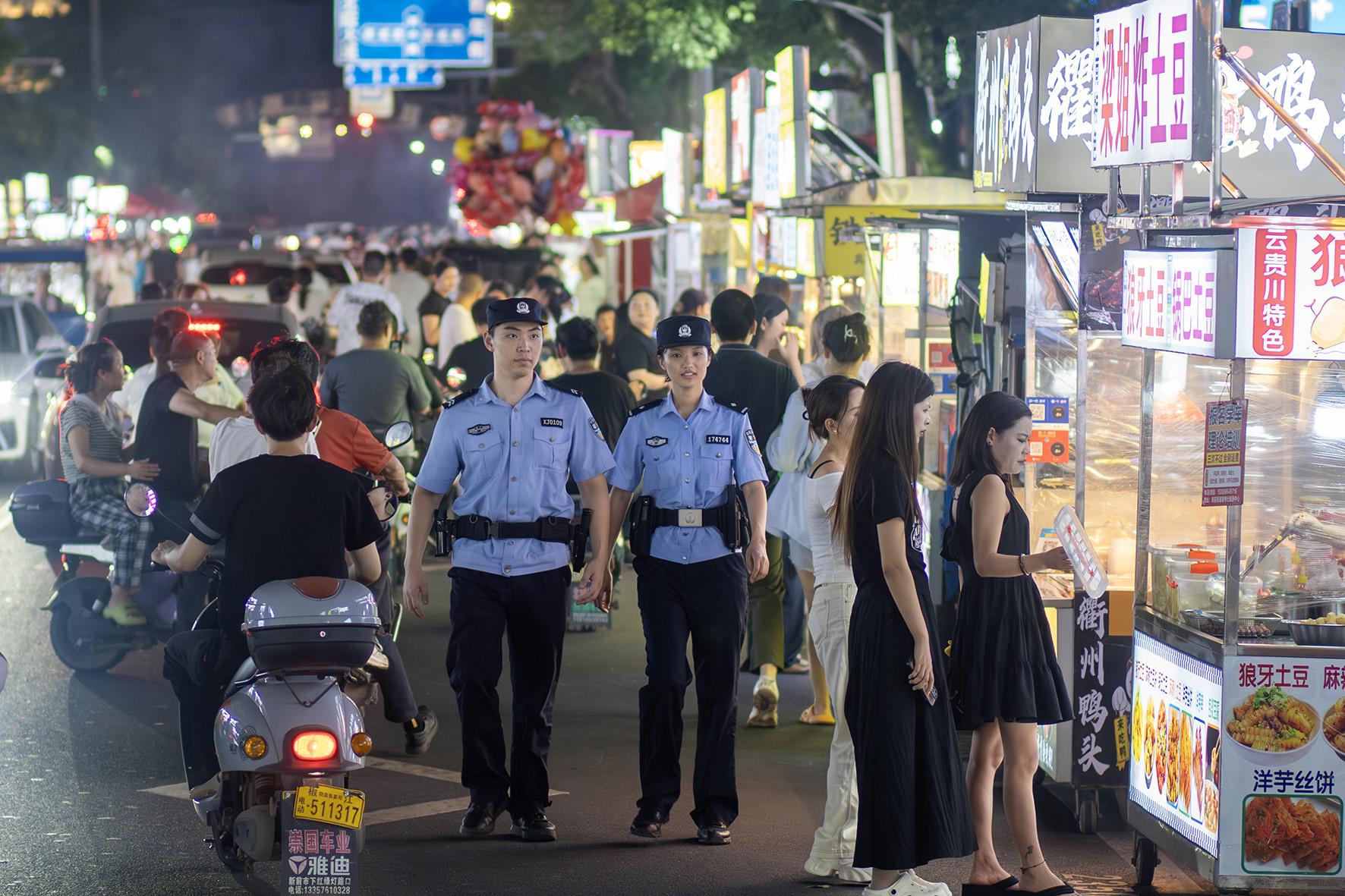 6月30日夜,浙江省臺(tái)州市公安局黃巖分局新前派出所民警輔警在西范夜市巡邏。入夏以來,臺(tái)州市公安局黃巖分局積極部署對(duì)城鄉(xiāng)夜市的巡邏防控,提升見警率,守護(hù)民間“煙火氣”,助力“夜經(jīng)濟(jì)”發(fā)展。