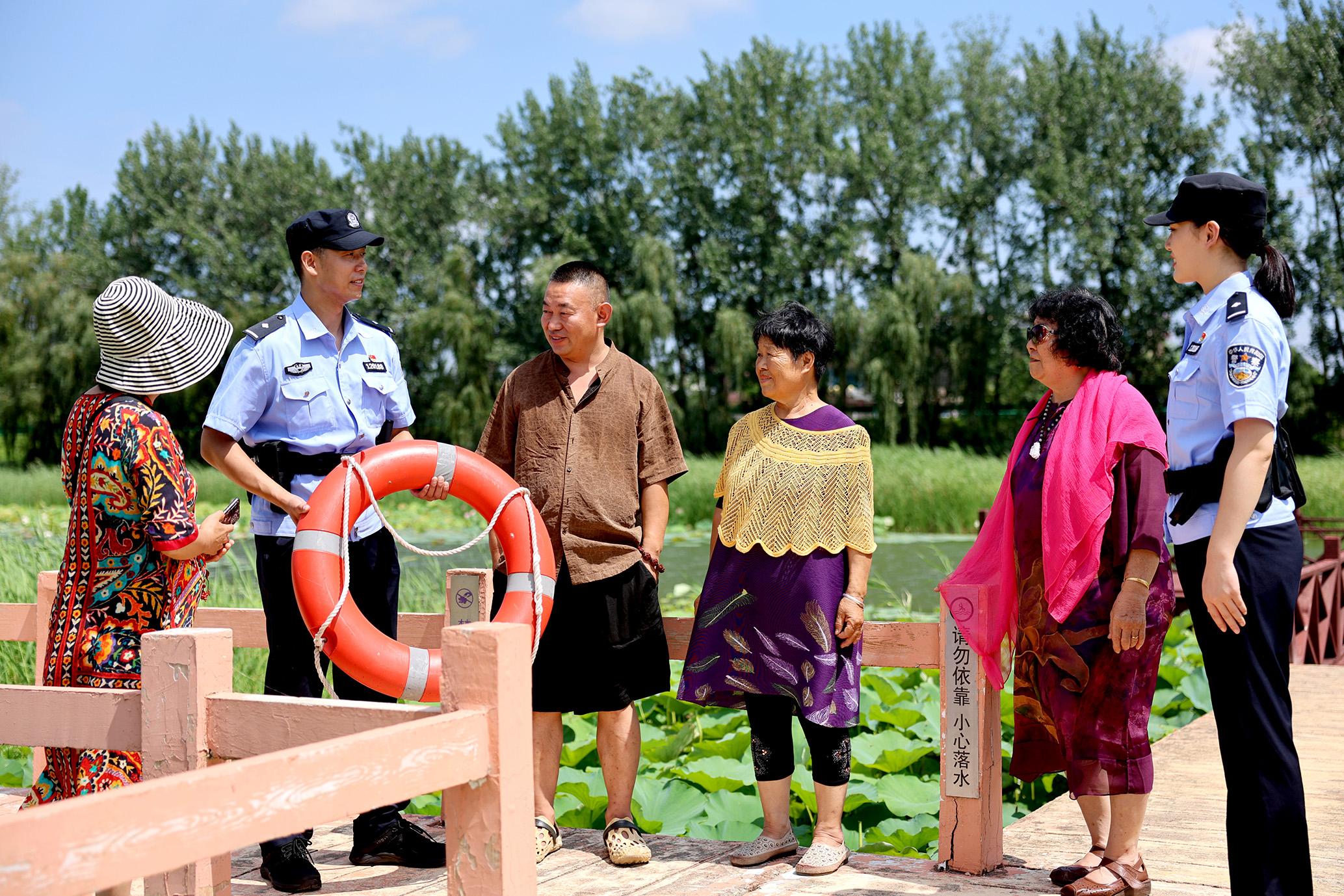 圖為7月9日,民警在京杭運(yùn)河濕地向游客講解防溺水知識(shí)。