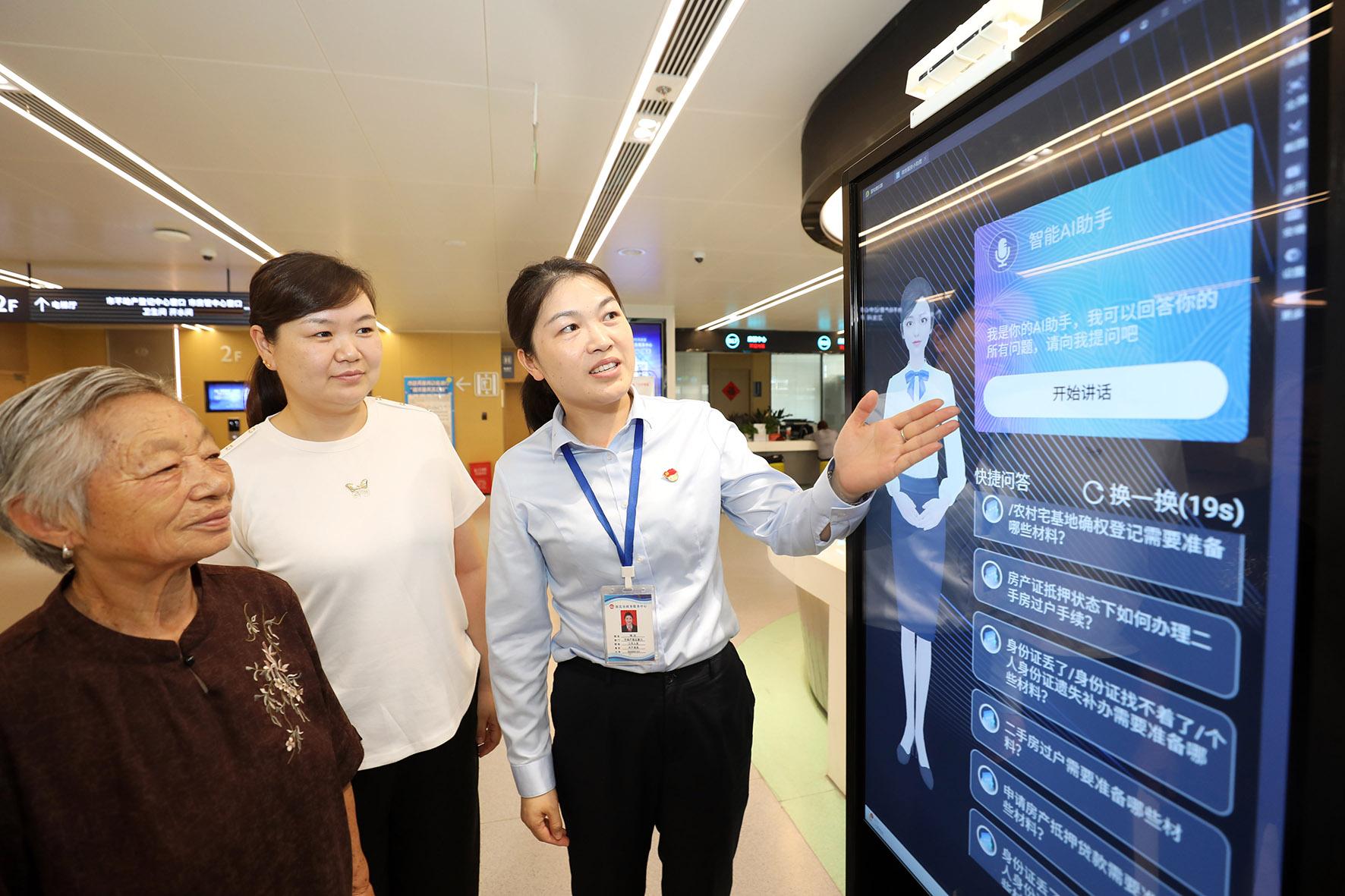7月15日,安徽省淮北市政務(wù)服務(wù)大廳不動產(chǎn)登記窗口工作人員利用“智能AI助手”指導(dǎo)辦事群眾進行咨詢業(yè)務(wù)。當(dāng)日,淮北市政務(wù)服務(wù)大廳不動產(chǎn)登記窗口“智能AI助手”投入使用,設(shè)備具有智能詢問解答導(dǎo)服功能,支持辦事群眾通過快捷、語音等多種方式進行交互。