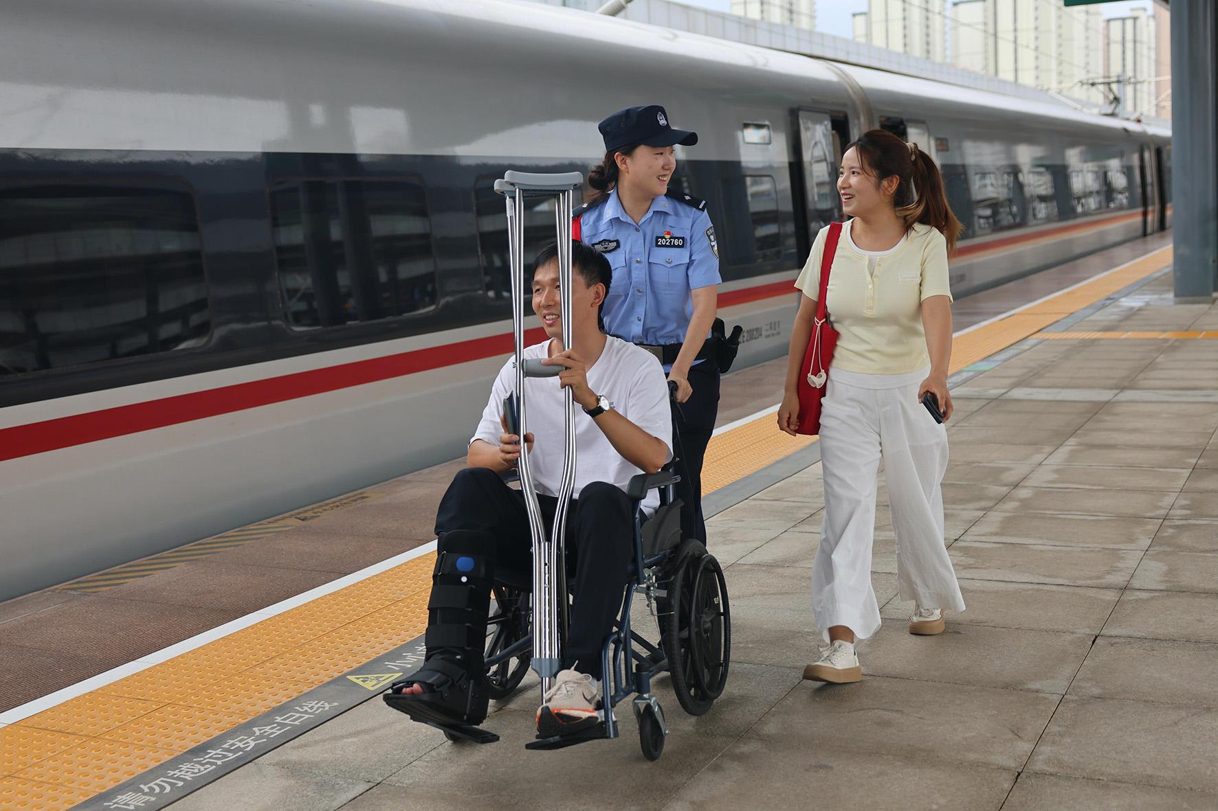 圖為8月5日,民警在站臺幫助行動不便旅客乘車。