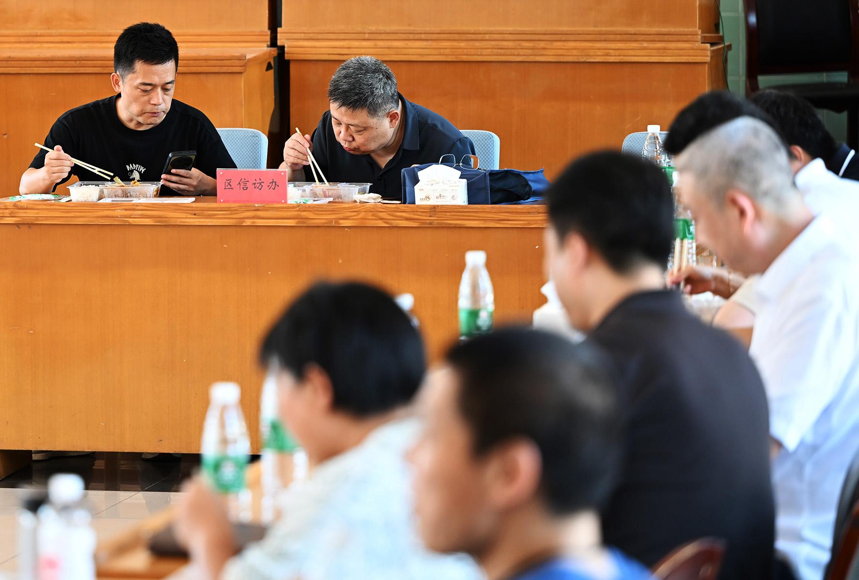 8月6日12時30分,忙碌了一上午的臨時“綜治中心”工作人員在辦公桌邊吃盒飯,邊商量著村民反映問題的解決辦法。