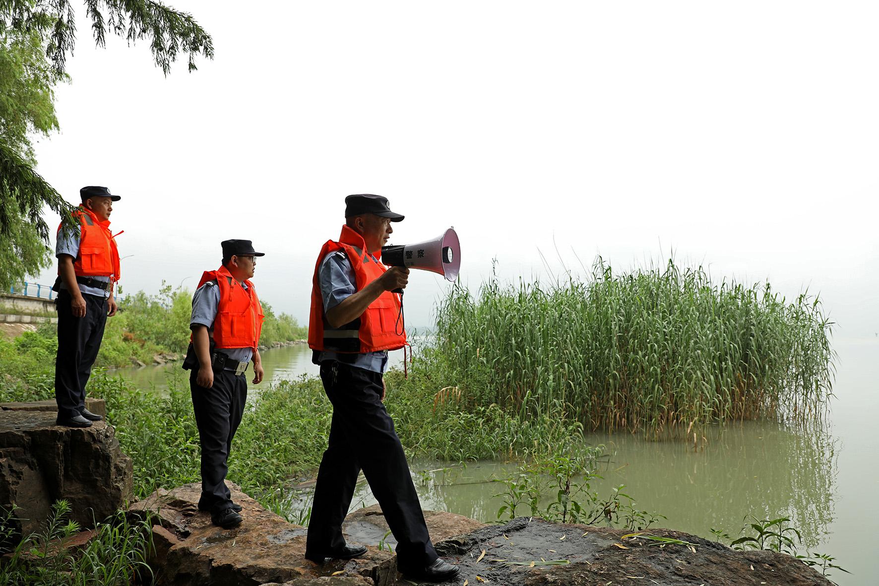 8月12日,安徽省巢湖市公安局民警在巢湖水域重點(diǎn)防汛部位巡邏巡查。同時(shí),向岸邊游玩的市民開(kāi)展安全提醒,筑牢防汛安全防線。