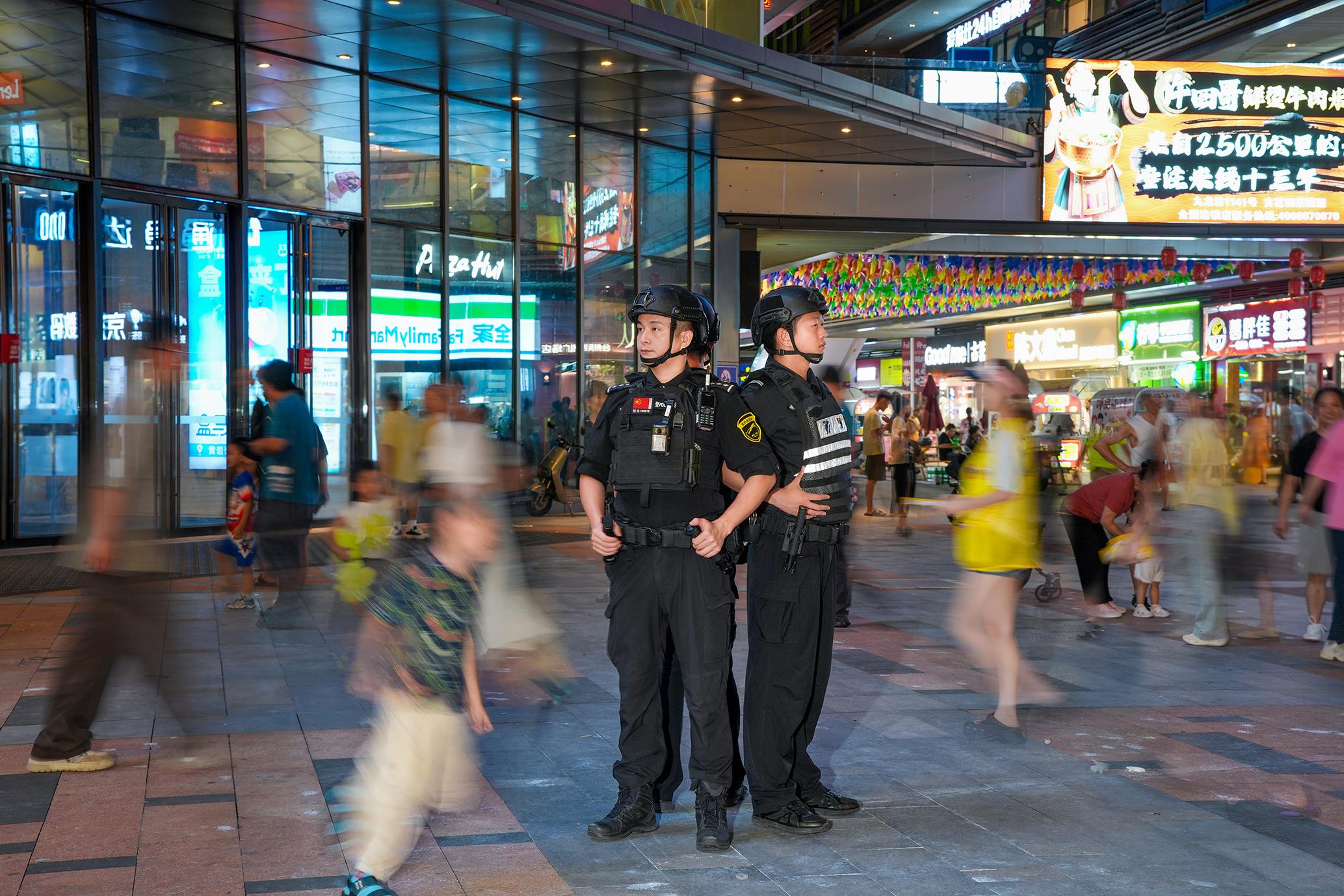 圖為8月12日夜晚,巡特警大隊民警在商業(yè)廣場巡邏執(zhí)勤。