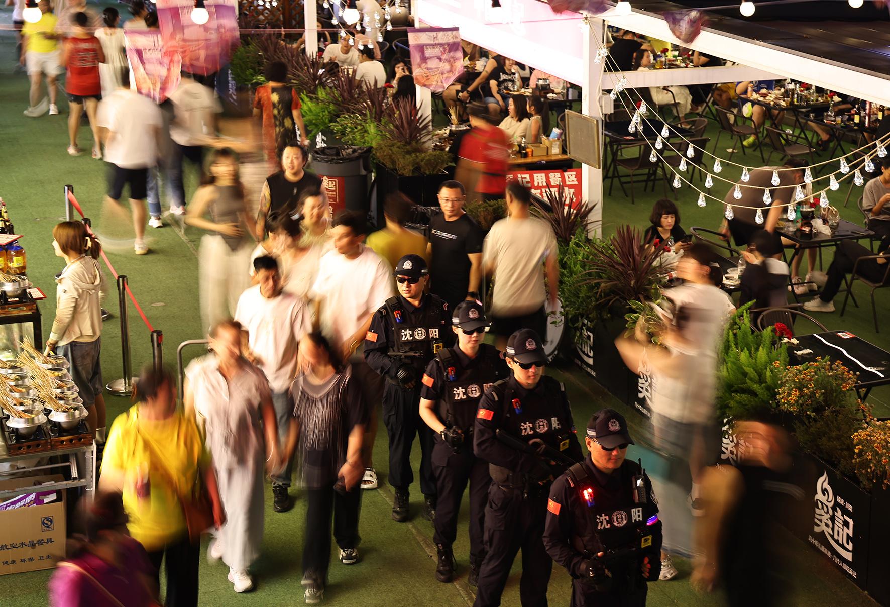 圖為8月18日晚,巡特警大隊民警在渾河外灘商業(yè)網(wǎng)點巡邏。