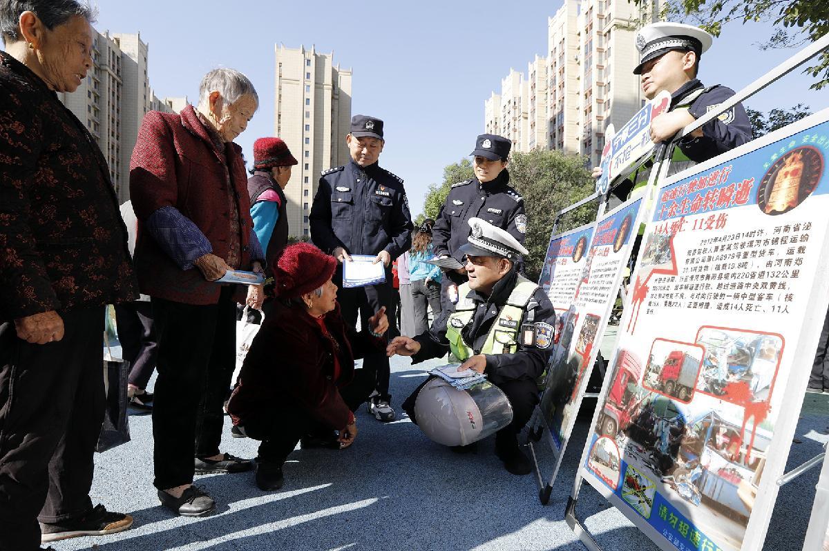 10月29日重陽節(jié),安徽省蕪湖市公安局交管支隊鳩江大隊民警輔警走進二壩鎮(zhèn)盛世華府小區(qū),向老年人群宣傳“一盔一帶”、反詐等安全知識。