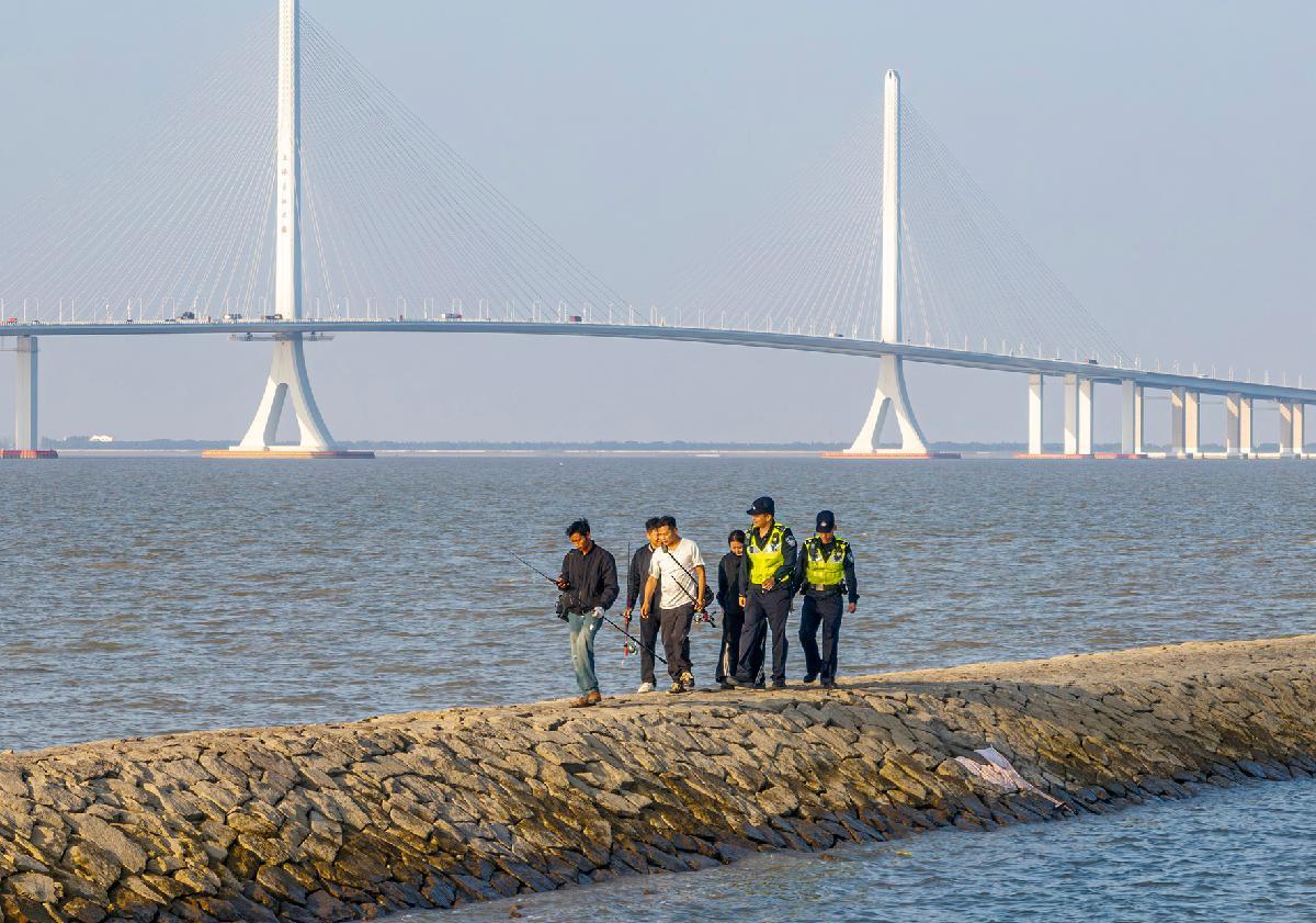 11月16日,上海市公安局崇明分局長興派出所民警勸離存在安全隱患的江堤丁字壩上的游客。