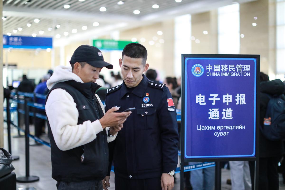 圖為二連出入境邊防檢查站移民管理警察協(xié)助蒙古國旅客網(wǎng)上填報(bào)外國人入境卡。