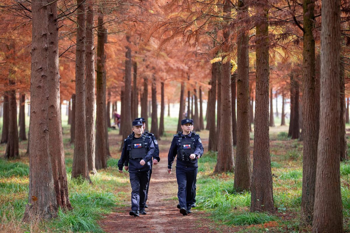 12月11日,浙江省臺州市公安局黃巖分局北洋派出所民警在上垟鄉(xiāng)白鷺灣濕地公園巡查。