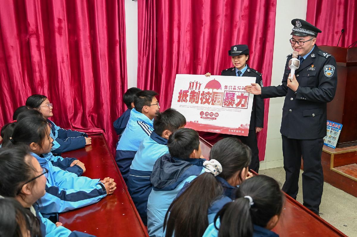 12月22日,安徽省馬鞍山市和縣公安局民輔警在功橋中學(xué)向?qū)W生講解預(yù)防校園欺凌知識。