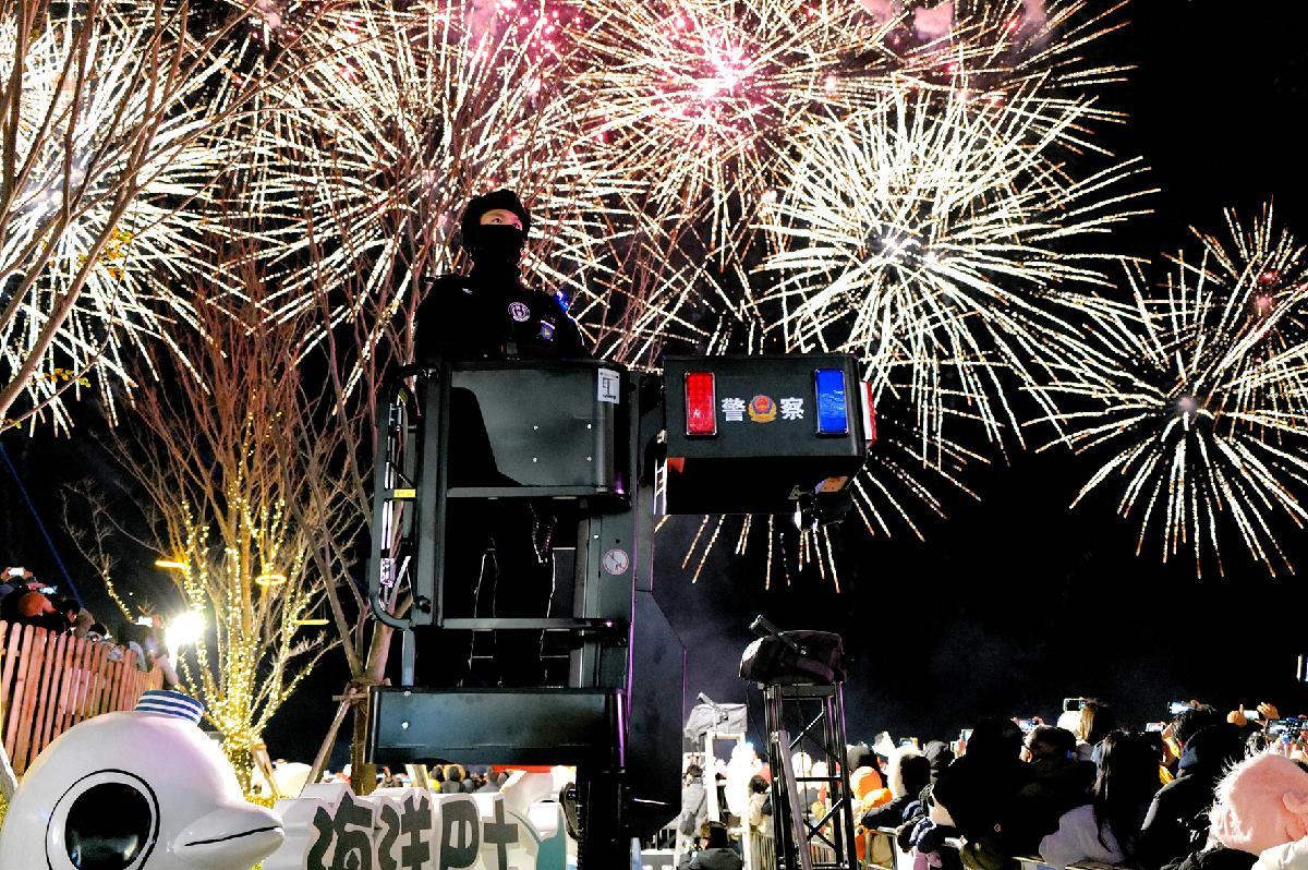 2025年12月31日晚,上海市公安局寶山分局民警在跨年迎新活動現(xiàn)場警用多功能升降瞭望臺上執(zhí)勤。
