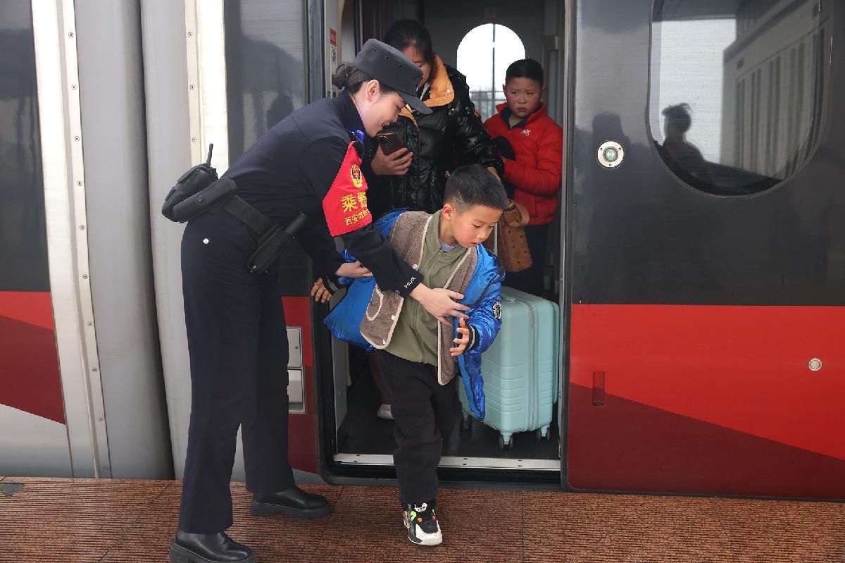 1月1日,西安鐵路公安局西安公安處民警幫助小朋友安全下車。