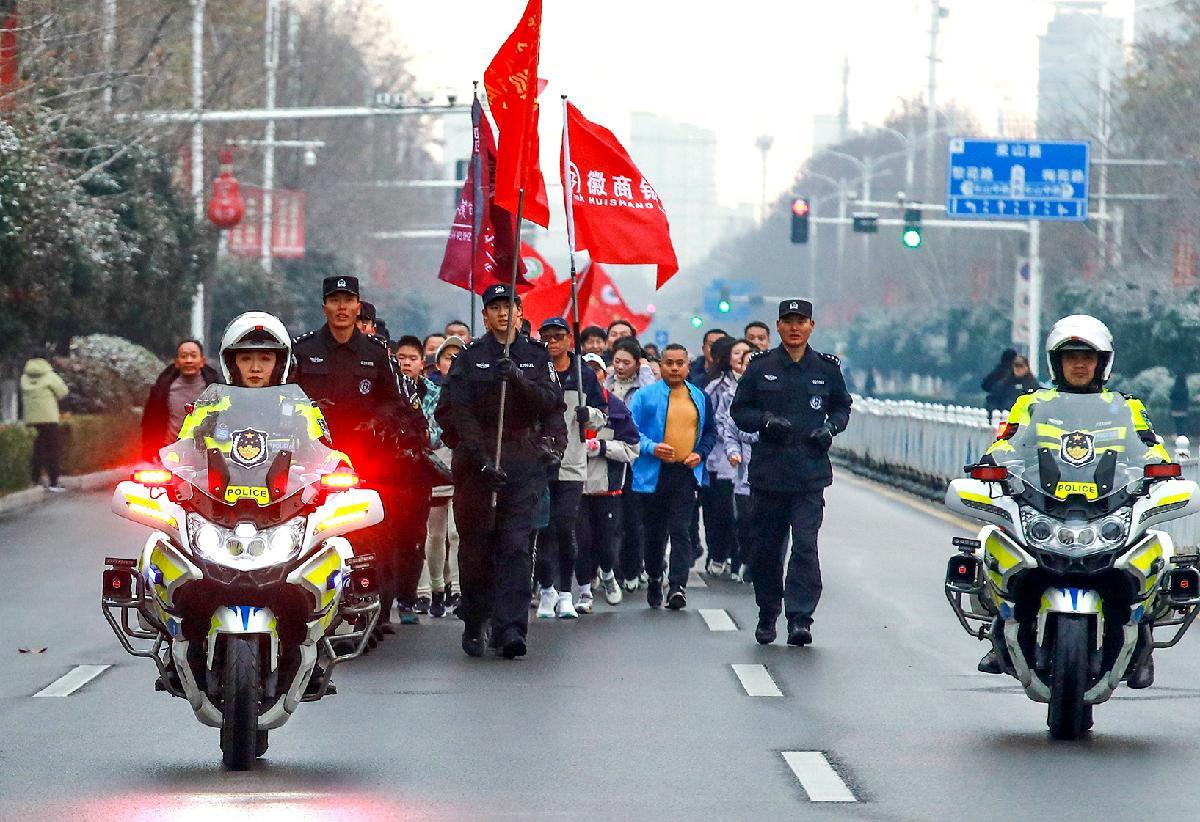 1月1日,安徽省淮北市公安局交通管理支隊相山大隊鐵騎隊員為元旦長跑暨健身健步走活動保駕護航。