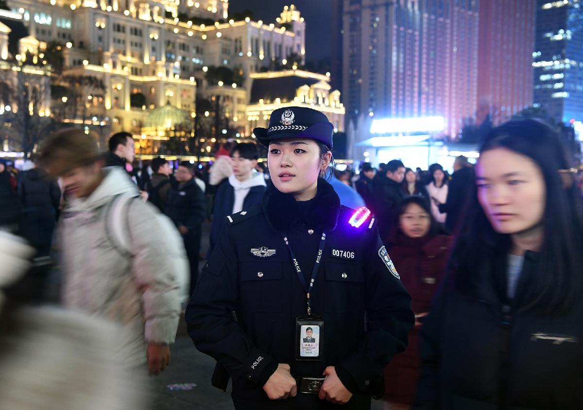 2025年12月31日晚,貴州省貴陽市公安局南明分局民警在跨年夜大型主題燈光秀現(xiàn)場執(zhí)勤。