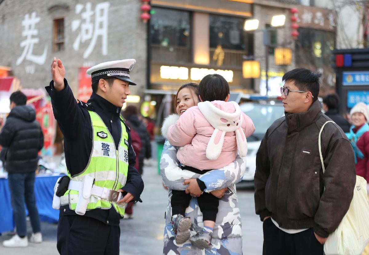 1月1日,安徽省蕪湖市公安局鏡湖交管大隊民警在古城景區(qū)執(zhí)勤,服務群眾。