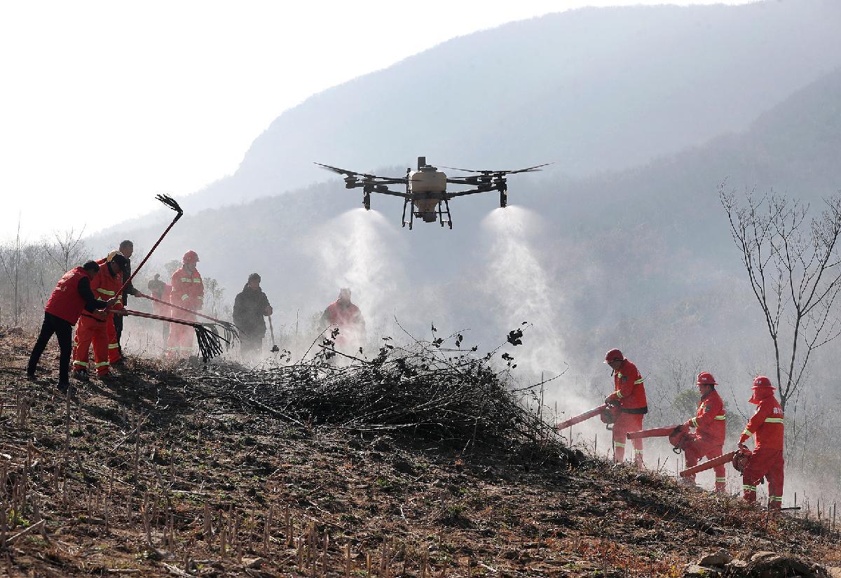 圖為1月7日,應(yīng)急隊(duì)員操縱無人機(jī)進(jìn)行火情偵察、熱源定位與低空滅火等森林防火實(shí)戰(zhàn)演練。
