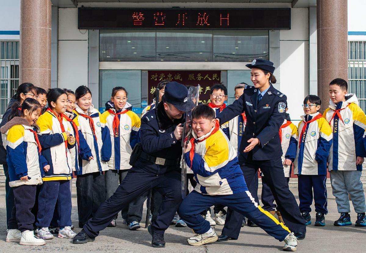 1月10日,江蘇省泰州市公安局海陵分局九龍派出所舉行警營開放日活動,邀請九龍實驗學校學生現(xiàn)場體驗警用裝備。