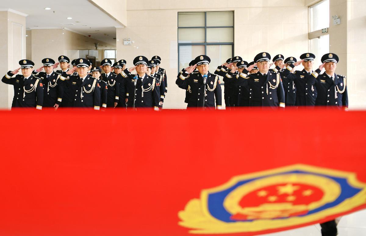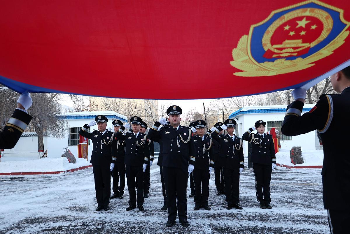 1月10日,新疆阿勒泰邊境管理支隊吉木乃邊境管理大隊舉行升警旗儀式,重溫入警誓詞。