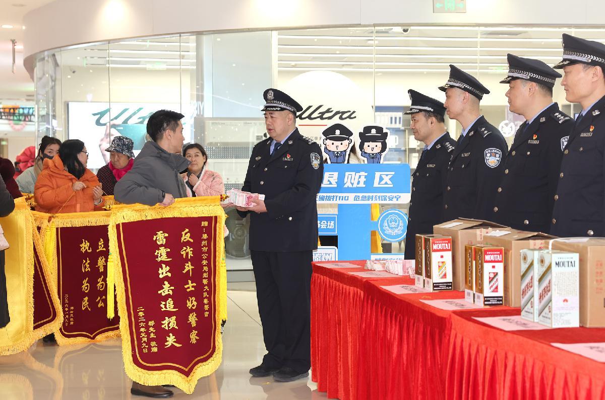 1月9日,山東省滕州市公安局在慶祝中國人民警察節(jié)宣傳活動現(xiàn)場,開展贓款贓物返還工作。