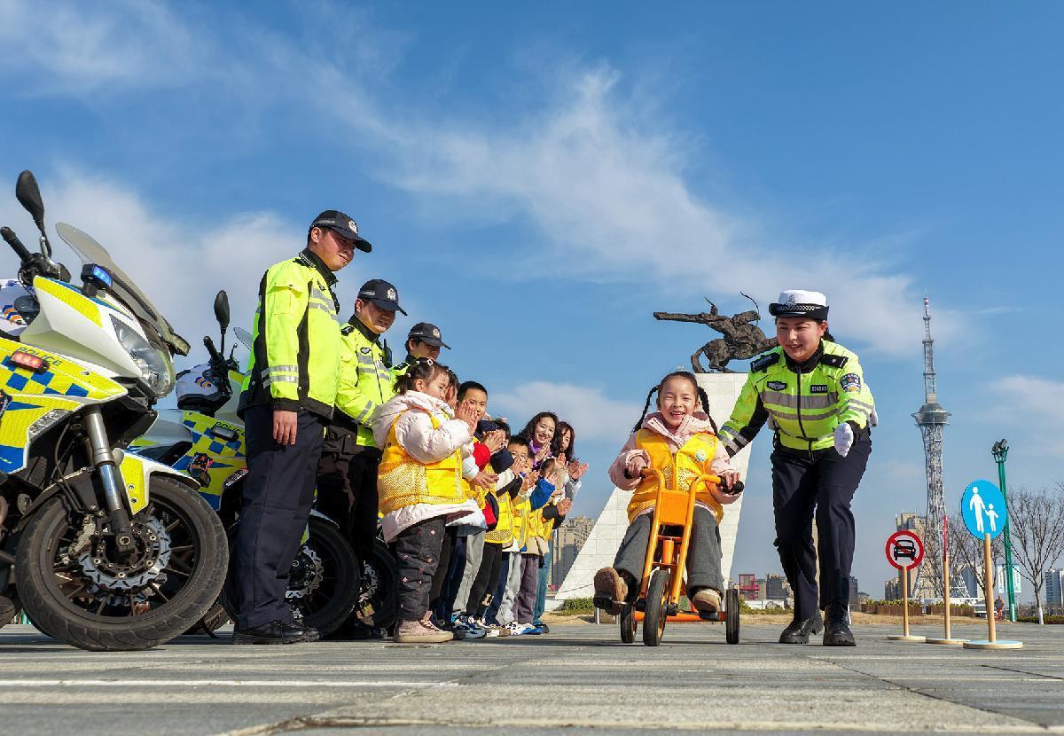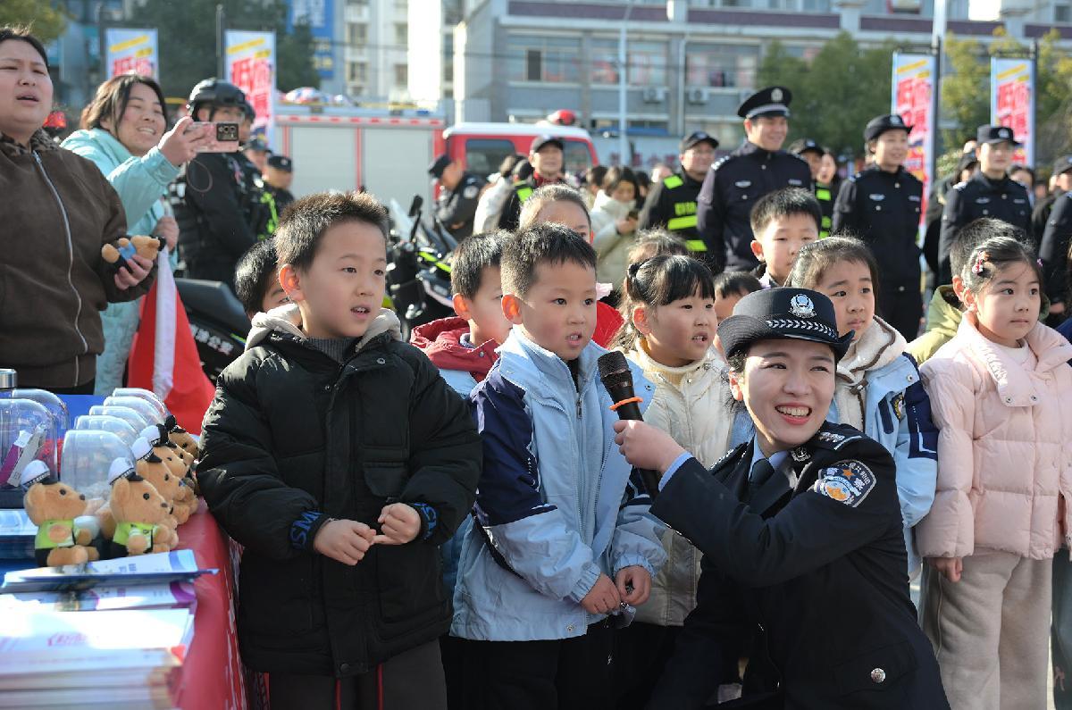 1月10日,江蘇省興化市公安局交管大隊民警通過游戲互動的方式向小朋友們講解交通安全知識。