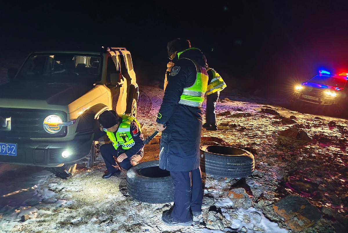 1月12日22時45分,新疆喀什科克牙爾邊境派出所接到110指派,稱一輛游客車輛在慕士塔格冰川公園附近迷失方向、輪胎爆胎被困。民警迅速趕往現(xiàn)場救援,歷經(jīng)3個小時,成功協(xié)助游客脫困。