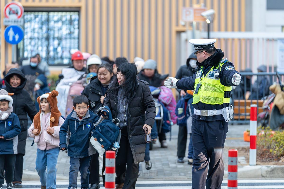 1月19日,上海地區(qū)迎來一輪寒潮降溫天氣。上海市公安局崇明分局交管支隊及時部署警力在學(xué)校周邊開展護(hù)校安園和交通疏導(dǎo)工作。