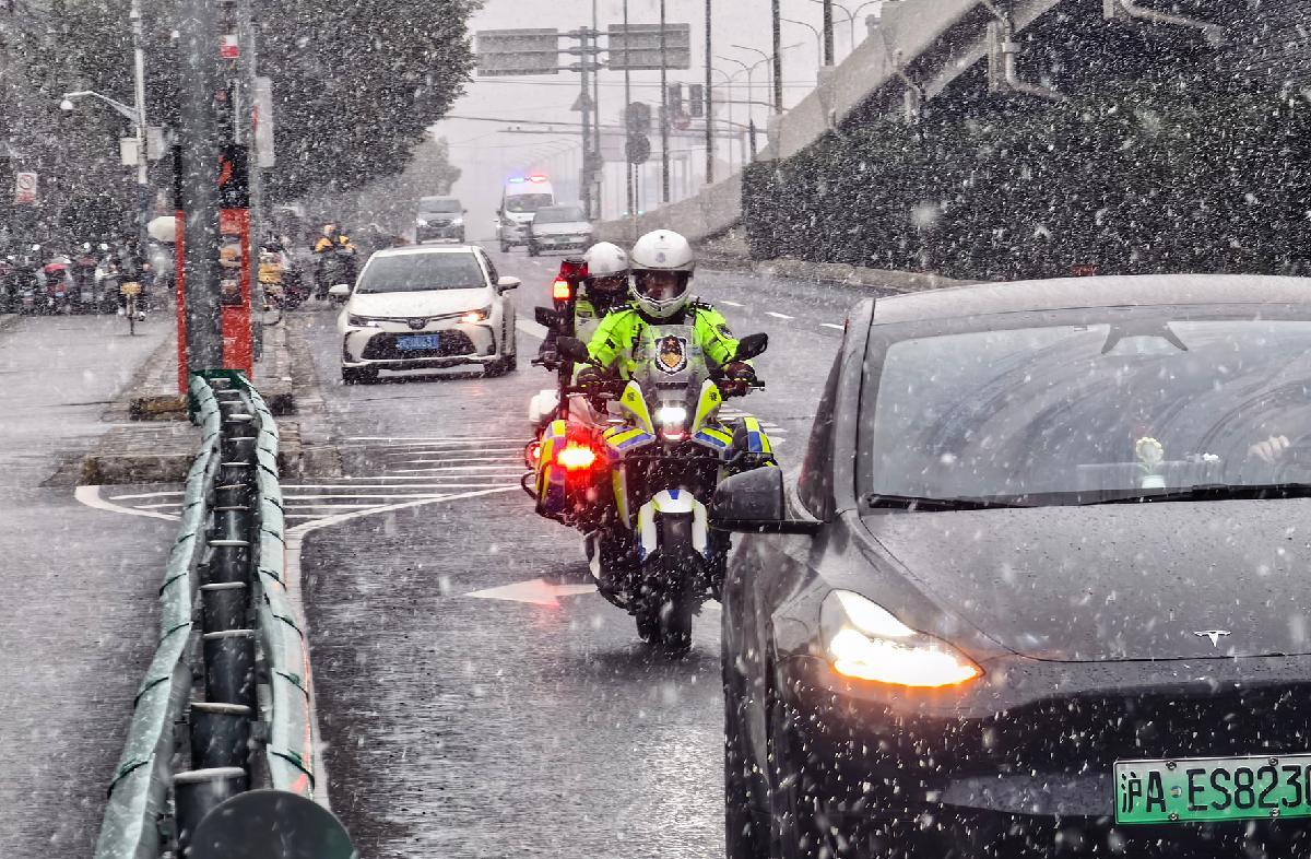 1月20日清晨,申城迎來雨雪天氣。上海市公安局閔行分局交管支隊顯性派警,在重點區(qū)域疏導(dǎo)交通,為民紓困。