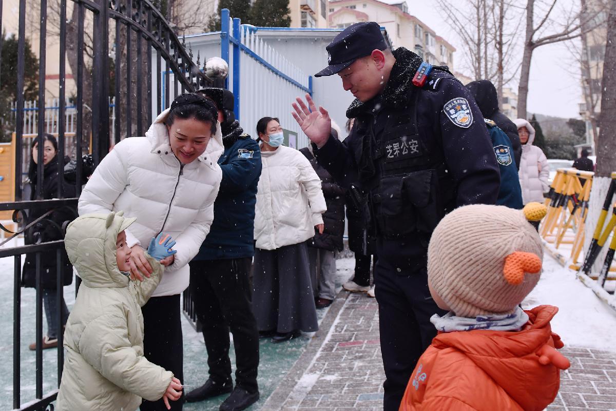 1月19日,山東省煙臺市公安局芝罘分局民警冒雪在轄區(qū)幼兒園門口執(zhí)勤,護(hù)送孩子們平安放學(xué)。