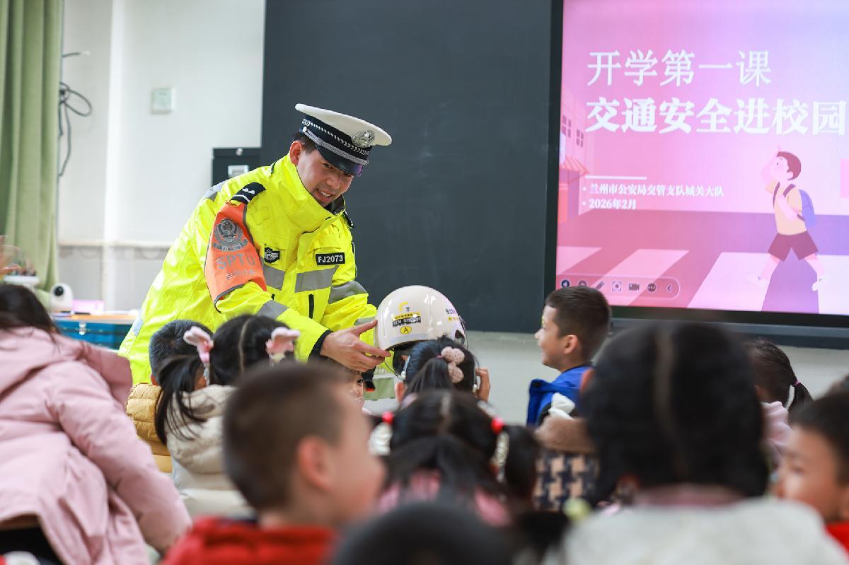 2月25日,甘肅省蘭州市公安局交管支隊(duì)城關(guān)大隊(duì)輔警在城關(guān)區(qū)水車園小學(xué)民勤街分校,為學(xué)生們講解交通安全知識(shí)。