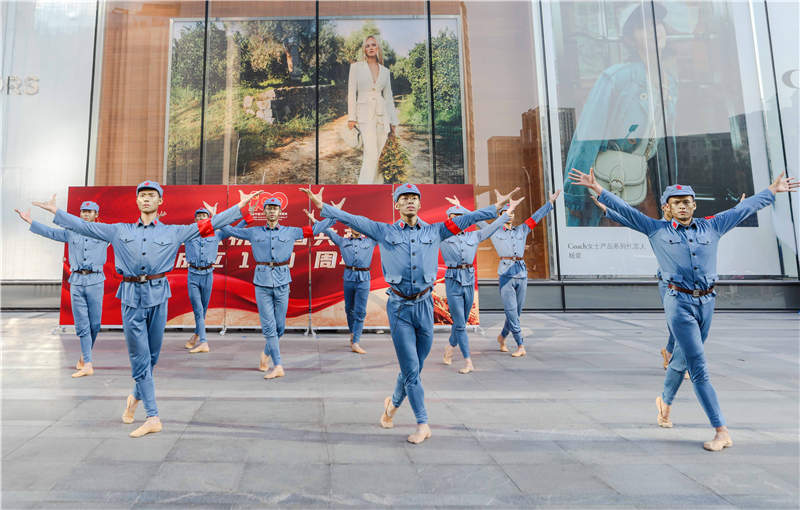下午6時整,伴隨著鋼琴伴奏聲響起,稚嫩的童聲吸引了所有人的關(guān)注,歌曲《歌唱祖國》拉開了快閃活動的序幕。隨后,一群身著紅軍服飾的舞蹈演員,從展板后走向舞臺中央,一曲《筑夢紅軍》的舞蹈將精神煥發(fā)、熱情飽滿,不畏生死的昂揚斗志表現(xiàn)得淋漓盡致,沖鋒在前、永不后退的革命精神感染了在場的市民。