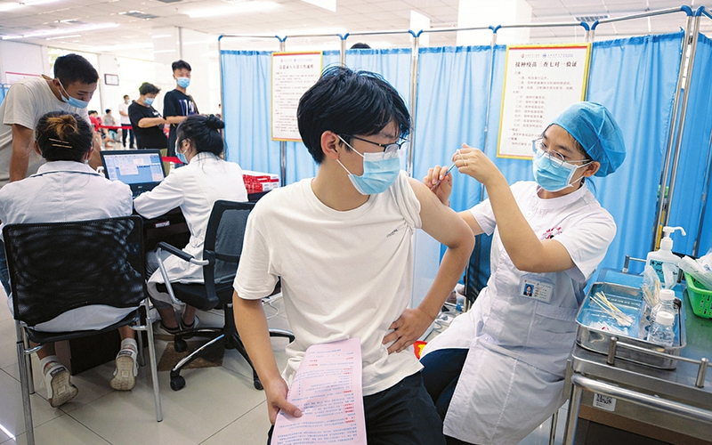 8月3日,在運城市中心醫(yī)院新冠病毒疫苗接種門診,醫(yī)務人員正為適齡市民接種疫苗。當前,根據(jù)全省統(tǒng)一部署,運城市8月開始在15-17歲人群中接種新冠病毒疫苗。據(jù)悉,該市所有無禁忌癥的15-17歲人群,由學校統(tǒng)一組織或自行前往疫苗接種點接種,8月底前完成第一劑接種。(閆鑫攝)